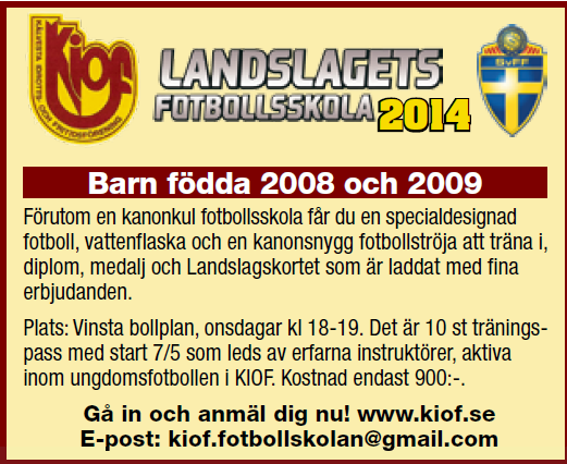 Nu är det inte så långt kvar till våren. Vi arrangerar återigen Landslagets Fotbollsskola med huvudinriktning på barn födda 2008/2009. Självklart är nybörjare i andra åldrar också välkomna. Vi kör fotbollskolan på Vinsta bollplan, onsdagar kl 18.00—19-00 (andra sidan vagen fran Coop Forum Vinsta). Det är 10 st träningspass, start 7/5, 14/5, 21/5, 28/5, 4/6, 20/8, 27/8, 3/9, 10/9 och 17/9. Skolan kostar 900:- och anmälan görs via webben genom att klicka här. 300:- i anmälningsavgift och resterande 600:- vid starttilfället. Vi ses på plan!