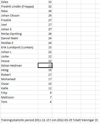 Träningsstatistik period 2011-11-15 t om 2012-03-29 Totalt träningar 35