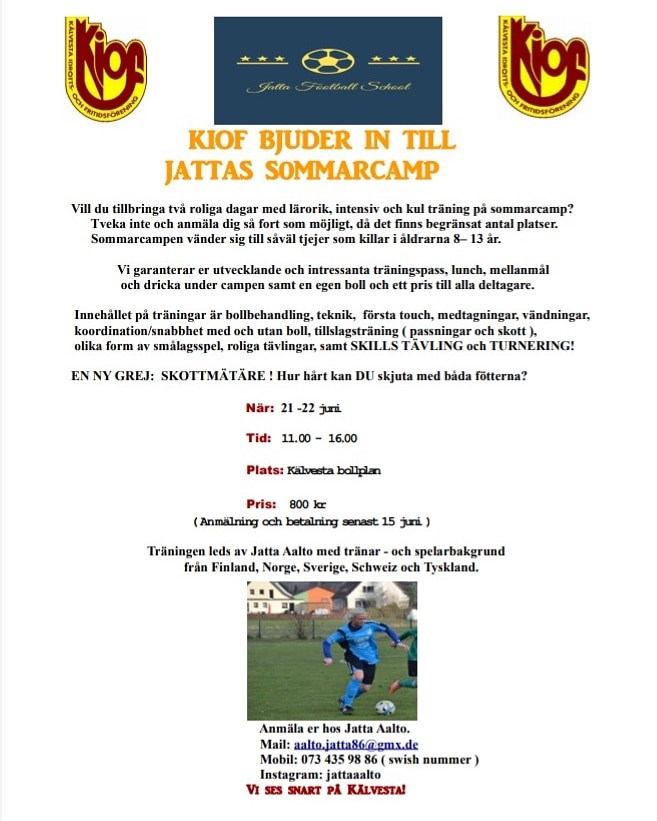 Lagom till att sommarvärmen kom till Stockholm kommer en rolig nyhet för KIOF-spelare! 21-22 Juni bjuder vi tillsammans med Jatta Aalto in till sommarcamp på Kälvesta Bollplan. Campen är öppen för spelare i Kiof i åldrarna 8år till 13år. Kostnad 800kr För Anmälan och betalning Maila: jatta.aalto86@gmx.de Avgiften swishas till jatta: 0734359886 Vi ses på Kälvesta Bollplan!
