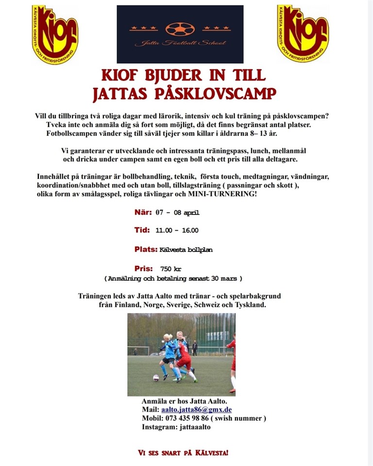 Missa inte chansen att delta på påsklovets roligaste camp! Öppet för spelare mellan 8-12 år i Kiof! För mer info ta kontakt med lagledare i respektive lag eller maila kansli@kiof.se Vi ses på Kälvesta! (Förutsatt att inga restriktioner ställer till det) Kälvesta IoF 7 mar 2021 0kommentarer